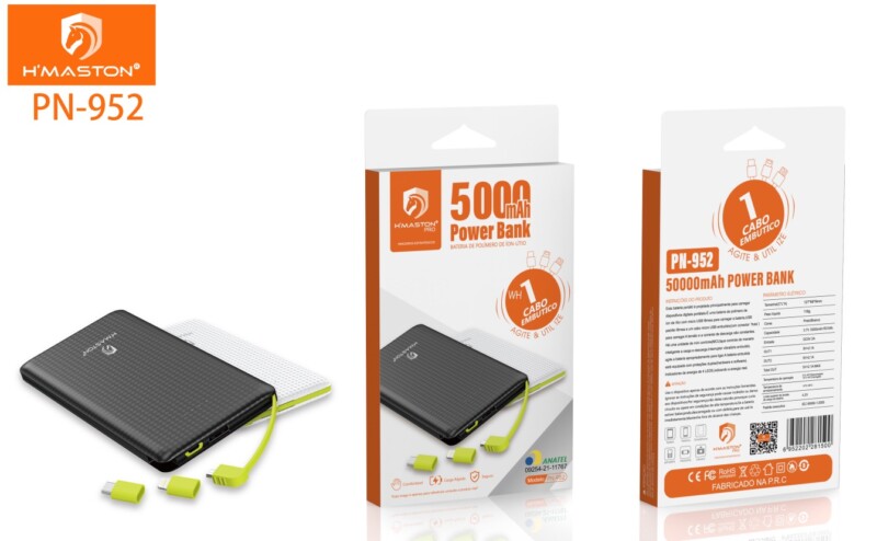 O HMaston PN952H é um carregador portátil versátil e potente, ideal para quem busca praticidade e eficiência no dia a dia. Com capacidade de 5000mAh, ele oferece duas portas de carregamento para múltiplos dispositivos simultaneamente. Seu design elegante com revestimento em couro garante durabilidade e um visual sofisticado. Com entradas Lightning, Tipo-C e Micro USB, ele é compatível com uma ampla gama de dispositivos, tornando-se uma escolha confiável para manter seus aparelhos sempre carregados.